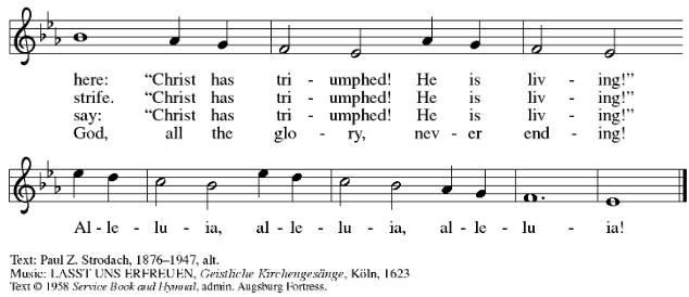 “Sitting in Luther’s church, you might have vaguely recognized the melody as a Latin chant sung at Easter, “Victimae paschali laudes.” Johann Walther (1496-1570) adapted it and published it in Geistliches Gesangbüchlein (Spiritual Songbook) in 1524. Subsequently, this became one of the most popular tunes of the Reformation. The sound of the music would remind you much more of the folk music you would hear in the village square outside the church than the choir music of the Roman Catholic Mass. The hymn captures the essence of the classic struggle between life and death. The resurrection represents the apex of this battle. With Christ’s rising from the grave, the “strong bands” of death were broken.”