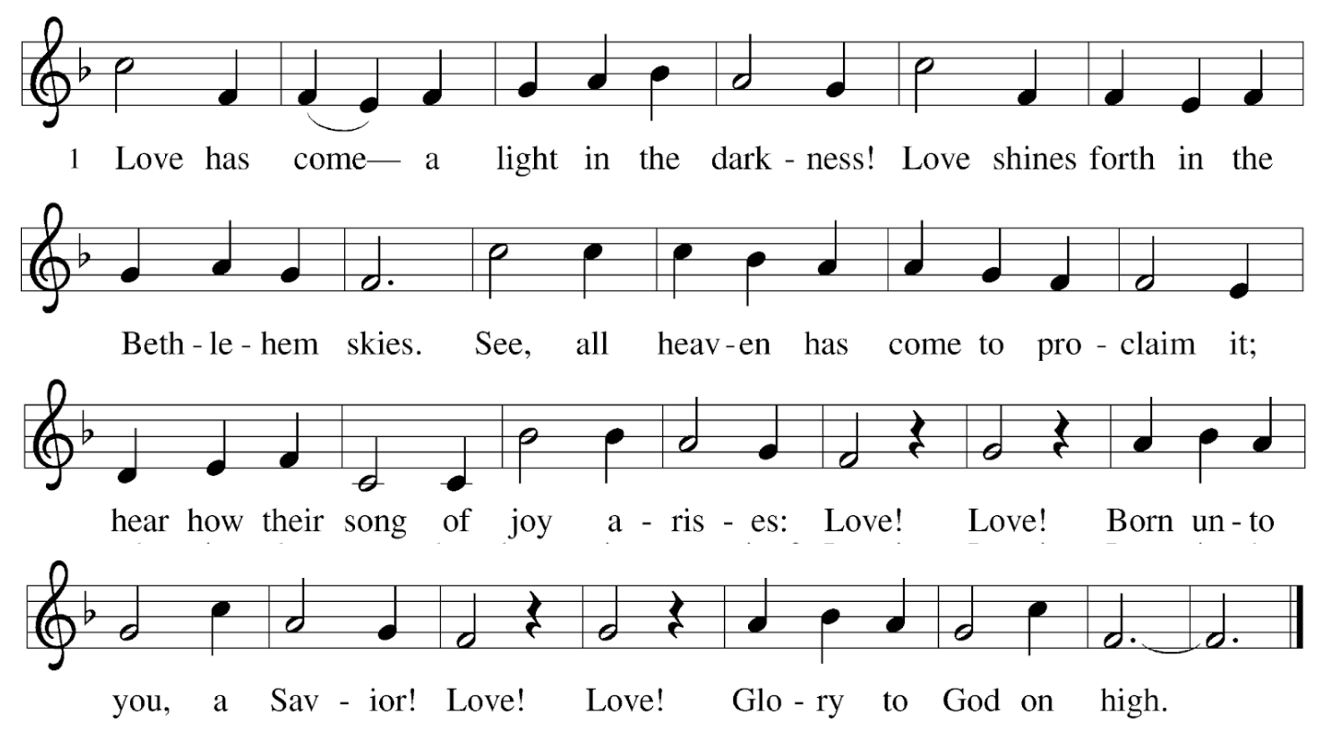 Love has come and never will leave us! Love is life everlasting and free. Love is Jesus within and among us. Love is the peace our hearts are seeking. Love! Love! Love is the gift of Christmas; Love! Love! Praise to you, God on high!