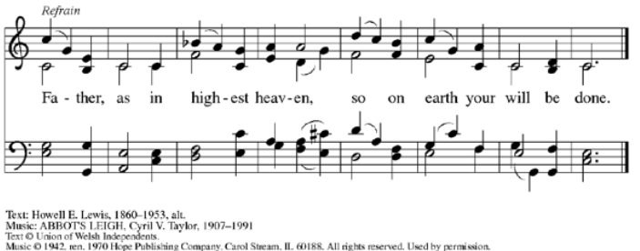 Our Father in heaven, hallowed be your name, your kingdom come, your will be done, on earth as in heaven. Give us today our daily bread. Forgive us our sins as we forgive those who sin against us. Save us from the time of trial and deliver us from evil. For the kingdom, the power, and the glory are yours, now and forever. Amen.