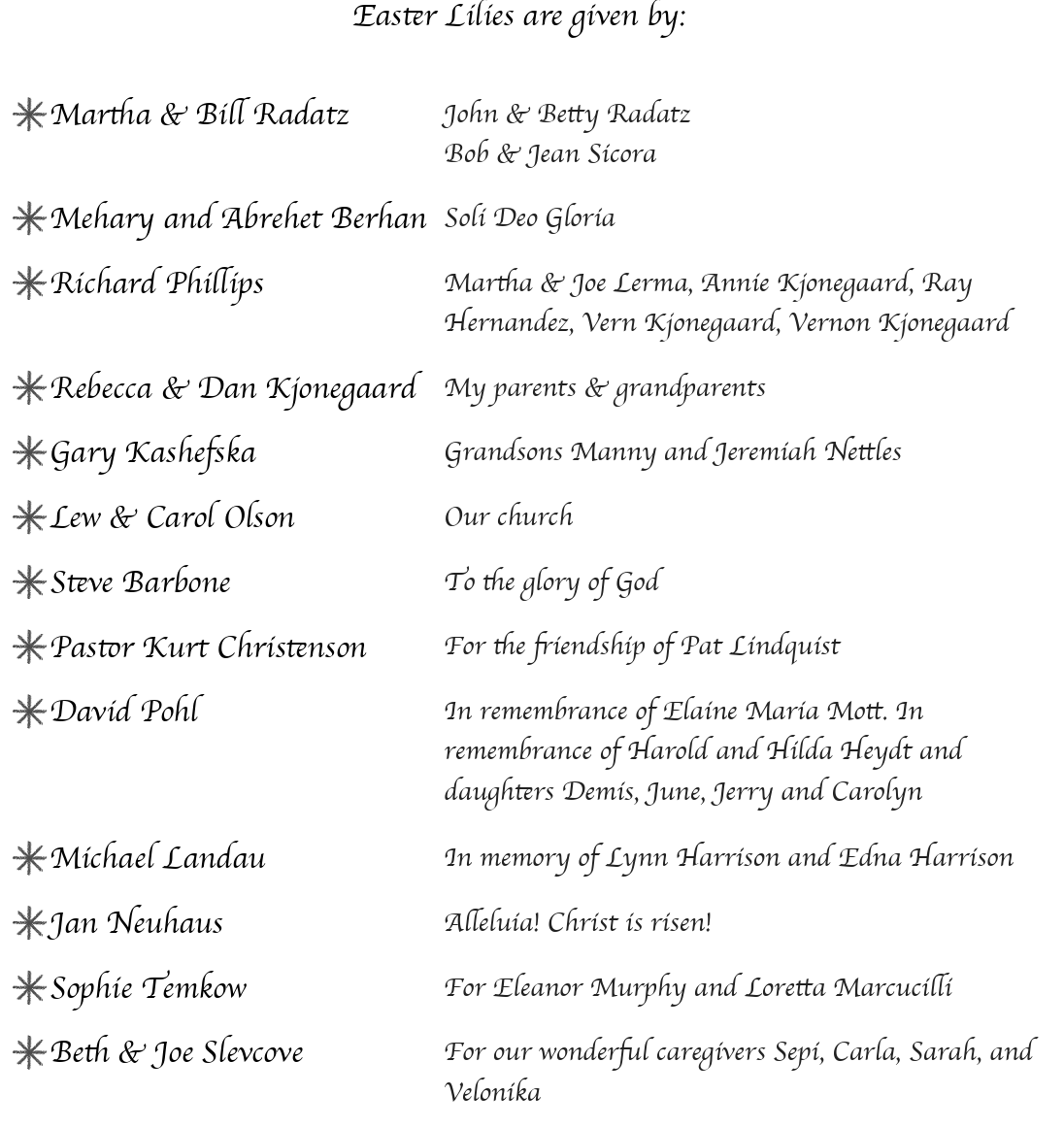- Dan & Bobbie Plough to our family and our First Lutheran family