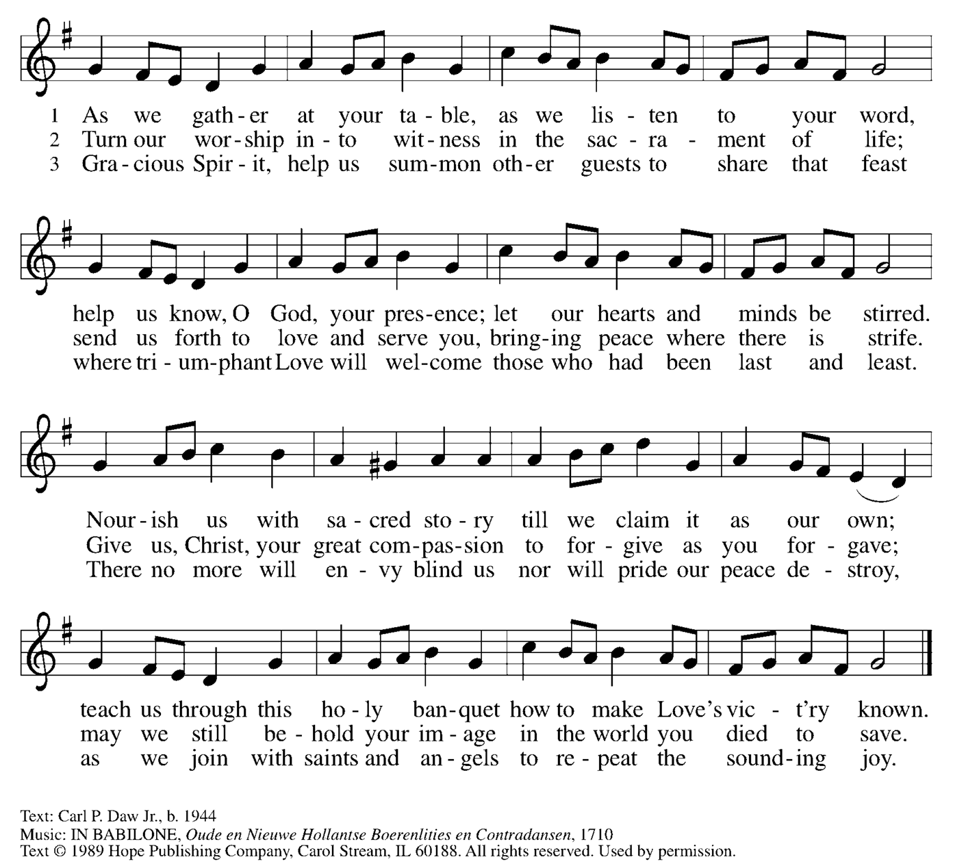 Remembering, therefore, his death, resurrection, and ascension, we await his coming in glory. Pour out upon us the Spirit of your love, O Lord, and unite the wills of all who share this heavenly food, the body and blood of Jesus Christ, our Lord; to whom, with you and the Holy Spirit, be all honor and glory, now and forever. Amen.